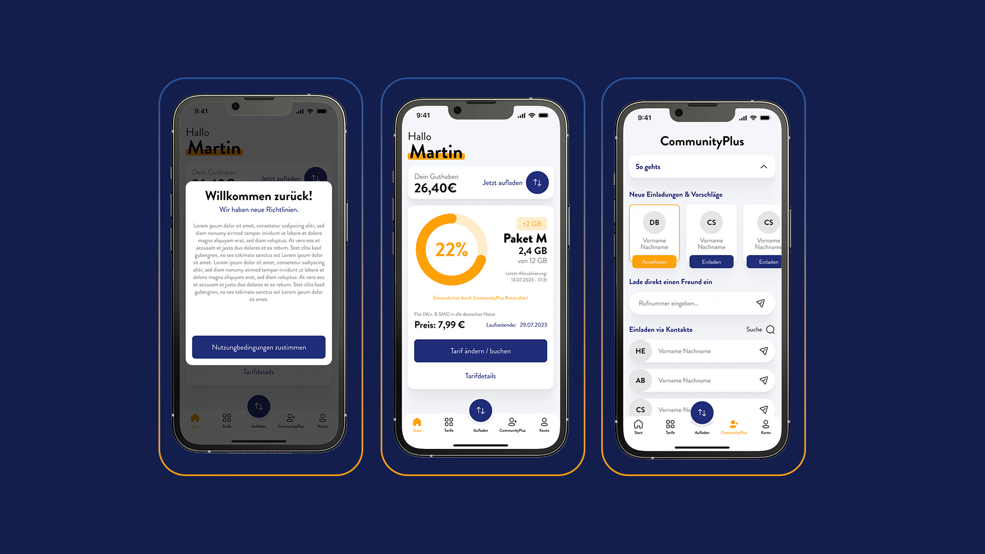 Zur Visualisierung und als Guideline zur Umsetzung entwickelten wir ein neues Design für die ALDI TALK-App und modellierten in Klick-Dummys die Customer-Journeys zu den jeweiligen Features.